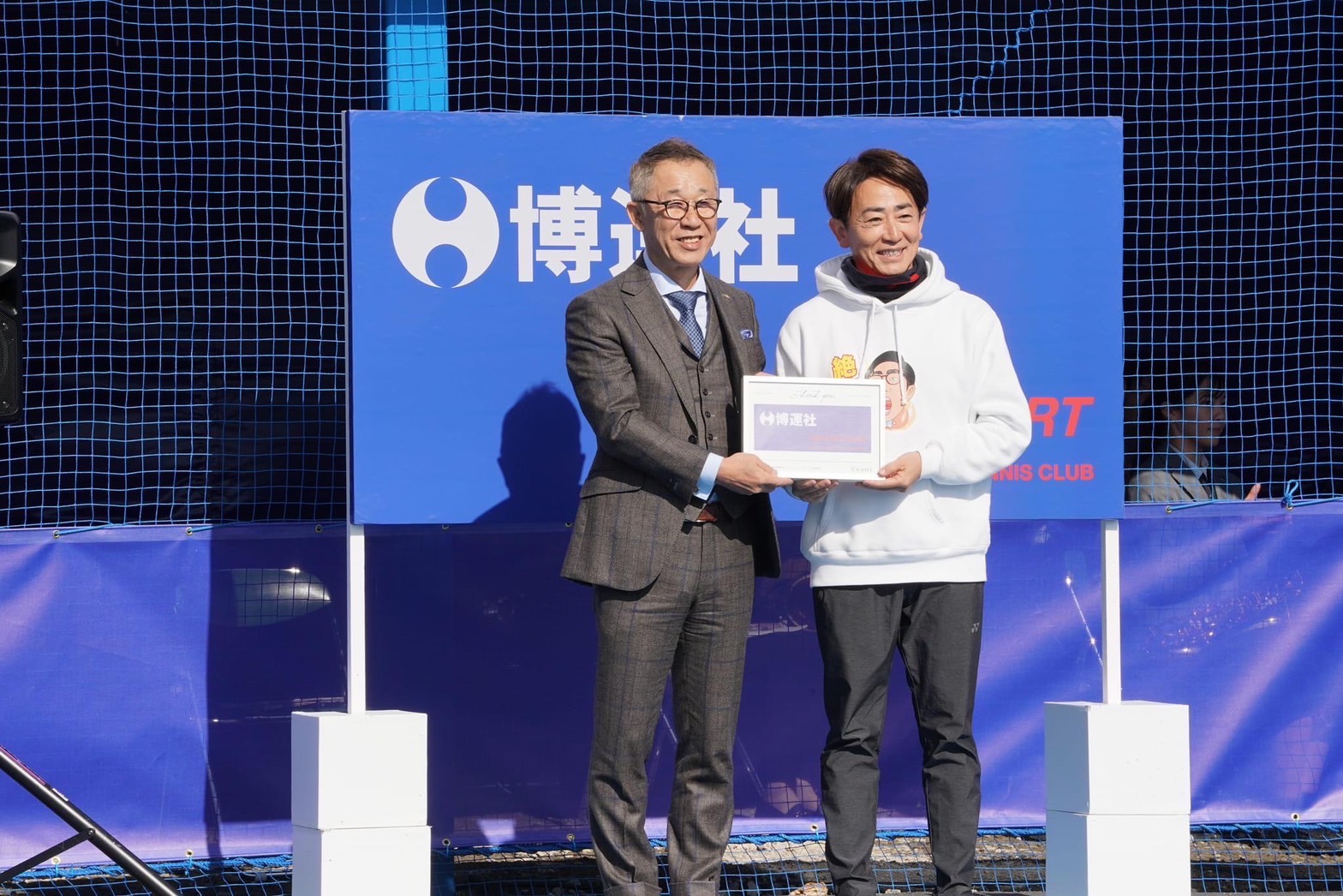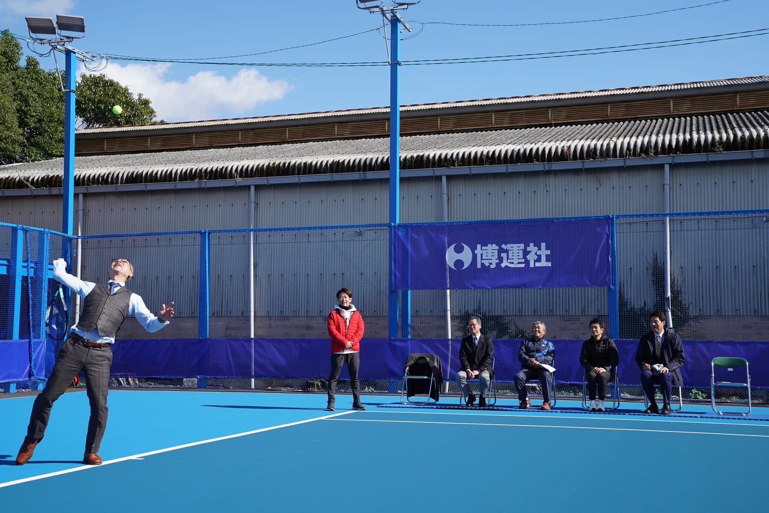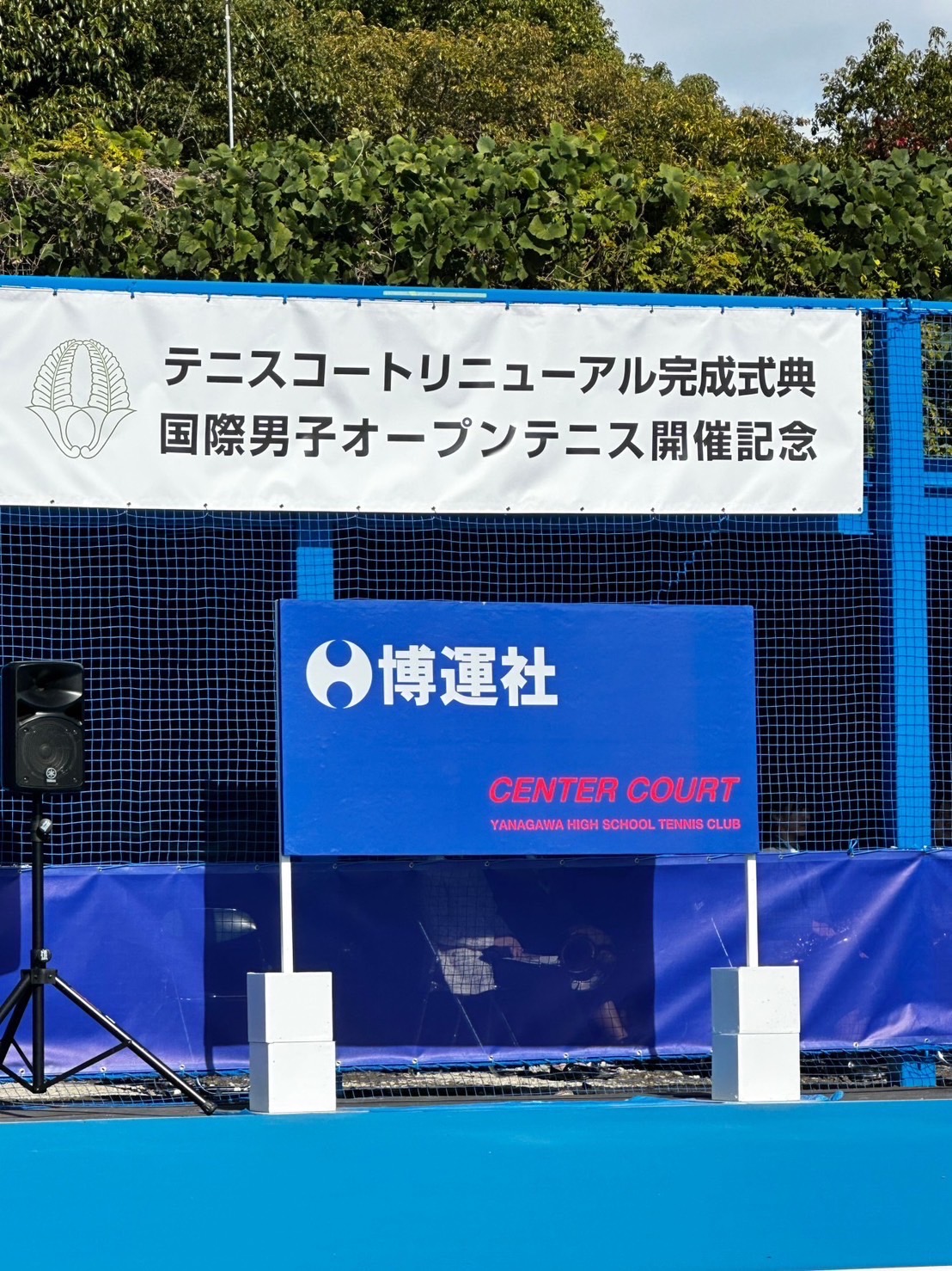 2023年11月18日、柳川高等学校テニスコート(博運社センターコート)で柳川高等学校男子国際オープンテニス開催記念とテニスコートリニューアル完成式典が行われ、主催者を代表して柳川高等学校理事長校長の古賀賢様より「株式会社 博運社 眞鍋和弘社長よりセンターコートを寄付していただきありがとうございました。このセンターコートにて12月国際男子オープン大会を開催いたします。ここから世界に羽ばたく選手が生まれるよう、柳川高校テニス部は大きく目標設定を変えて参ります。皆さま今後ともご支援ご協力賜りますようよろしくお願い申し上げます」とのご挨拶がありました。