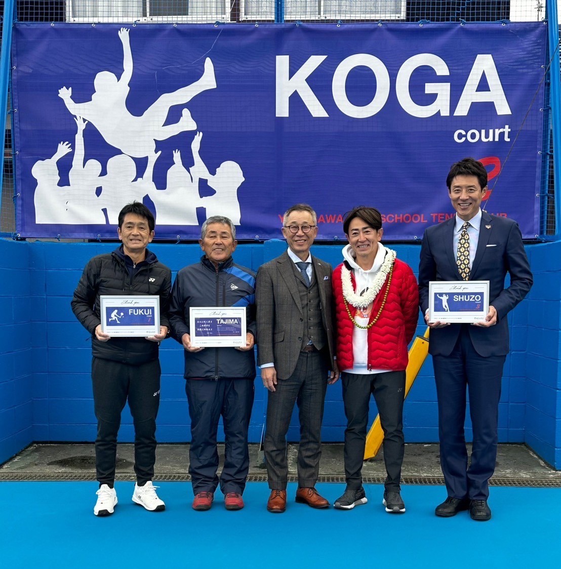 この式典を機に柳川高校のこれまでのコートに新たにネーミングがなされ、1番コートは「FUKUI COURT」、2番コートは「KOGA COURT」、3番コートは「SHUZO COURT」、そして8番コートは「博運社Center COURT」と名付けられています。今後も柳川高等学校テニス部の皆様のご活躍とご健勝を 祈念し、支援させて頂きたいと思います!