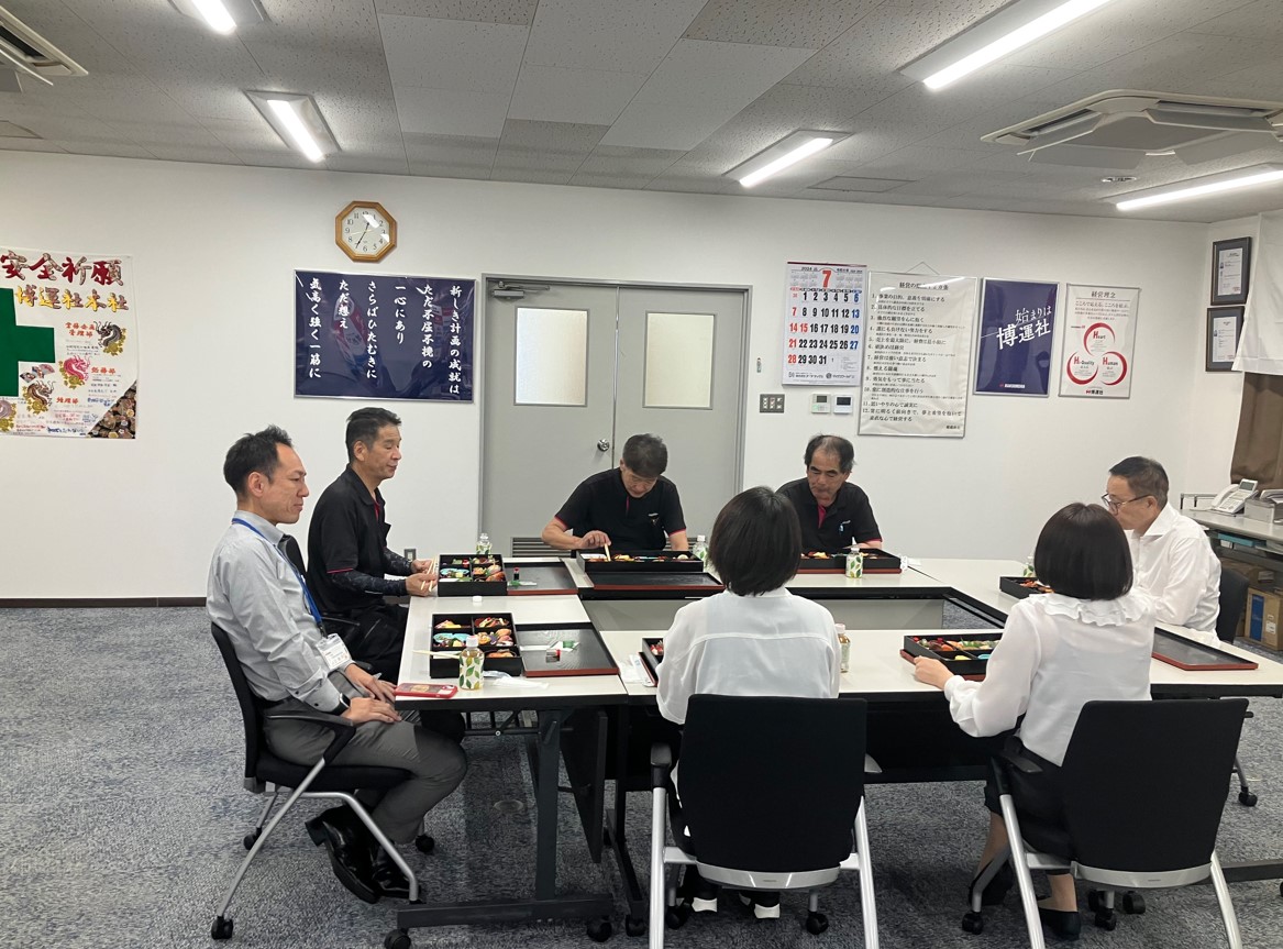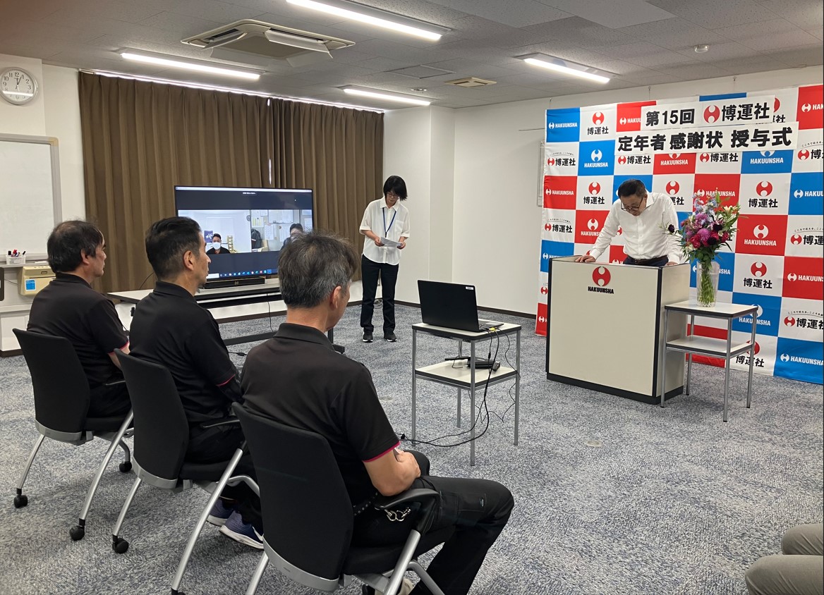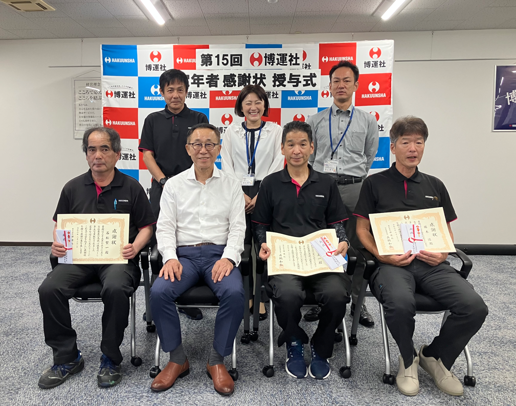 令和6年7月22日(月) 第15回定年者感謝状授与式が開催されました。永年にわたる会社への貢献に対して、深い敬意と感謝の意を表し、社長から一人ひとりへ感謝状と記念品が授与されました。今回は、小郡営業所・宮崎生協・佐賀営業所・本社倉庫の4名の方が表彰され、昼食会では会社での思い出話で盛り上りながら、和やかなひとときを過ごしました。なお、4名の方は再雇用制度を利用して引き続き勤務されております。長年の勤続に心より感謝申し上げるとともに今後のご健康とご活躍をお祈り致します。